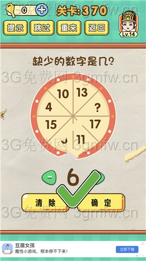 缺少的数字是几是《脑力达人全民烧脑游戏》第370关的问题,很多网友不知道答案是什么,下面小编给大家带来脑力达人全民烧脑游戏第370关攻略。 问题:缺少的数字是几? 答案:6。 老友网www.andlaou.com免费为你分享