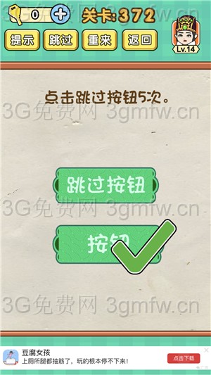 点击跳过按钮5次是《脑力达人全民烧脑游戏》第372关的问题,很多网友不知道答案是什么,下面小编给大家带来脑力达人全民烧脑游戏第372关攻略。