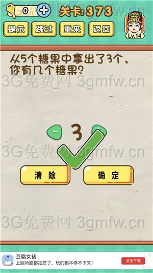 从5个糖果中拿出了3个你有几个糖果是《脑力达人全民烧脑游戏》第373关的问题,很多网友不知道答案是什么,下面小编给大家带来脑力达人全民烧脑游戏第373关攻略。