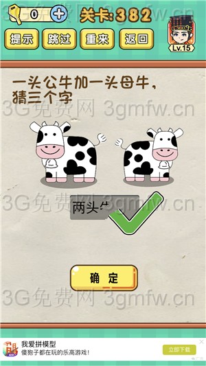 一头公牛加一头母牛猜三个字是《脑力达人全民烧脑游戏》第382关的问题,很多网友不知道答案是什么,下面小编给大家带来脑力达人全民烧脑游戏第382关攻略。