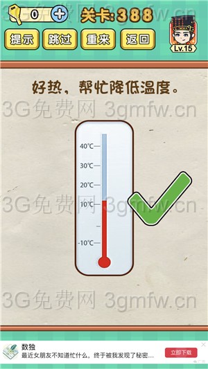 好热帮忙降低温度是《脑力达人全民烧脑游戏》第388关的问题,很多网友不知道答案是什么,下面小编给大家带来脑力达人全民烧脑游戏第388关攻略。 问题:好热帮忙降低温度? 答案:用力摇晃手机。 老友网www.andlaou.com免费为你分享