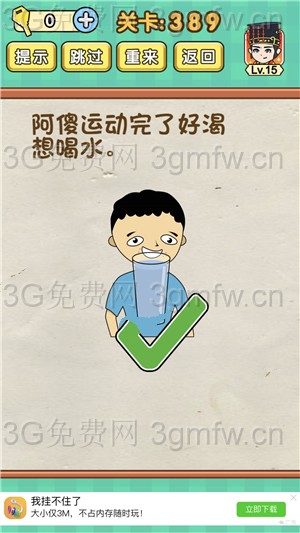 阿傻运动完了好渴想喝水是《脑力达人全民烧脑游戏》第389关的问题,很多网友不知道答案是什么,下面小编给大家带来脑力达人全民烧脑游戏第389关攻略。