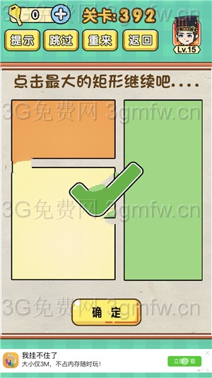 点击最大的矩形继续吧是《脑力达人全民烧脑游戏》第392关的问题,很多网友不知道答案是什么,下面小编给大家带来脑力达人全民烧脑游戏第392关攻略。