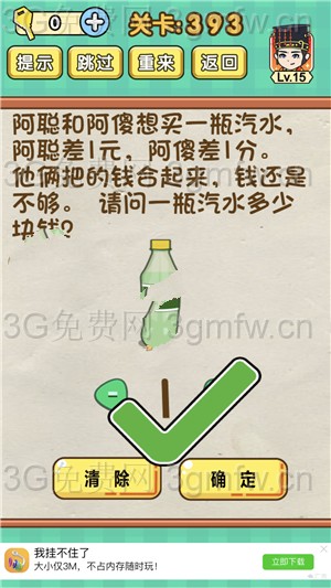 阿聪和阿傻想买一瓶汽水,阿聪还差1元,阿傻差1分。他两把钱合起来还是不够,请问一瓶汽水多少钱是《脑力达人全民烧脑游戏》第393关的问题,很多网友不知道答案是什么,下面小编给大家带来脑力达人全民烧脑游戏第393关攻略。