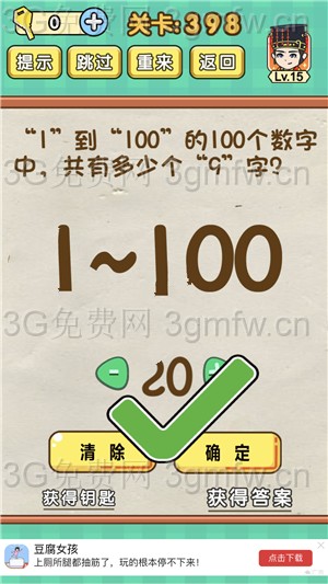 1到100的100个数字中共有多少个9字是《脑力达人全民烧脑游戏》第398关的问题,很多网友不知道答案是什么,下面小编给大家带来脑力达人全民烧脑游戏第398关攻略。