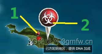 己方开局地点会有如下1号位置的红点标识,在己方地区未暴露之前可以定期获得红点催生出的DNA加成气泡。当你感染一个新的地区时红色感染气泡便会出现。
