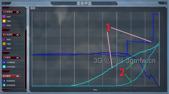 【会看统计图有时也会帮助你了解游戏,比如说第二组解药线在后期某个时刻有相交处,该处说明对方解药研发完成比例为100%,对方病原体正在被治愈。】
