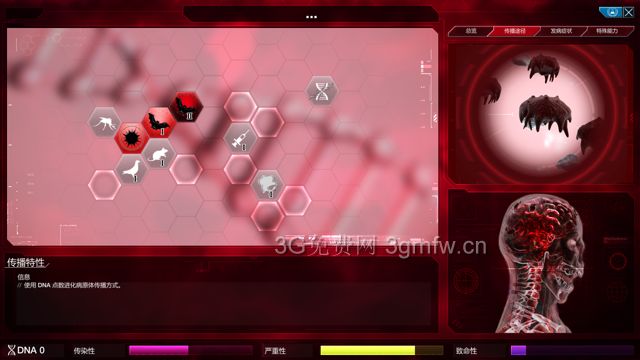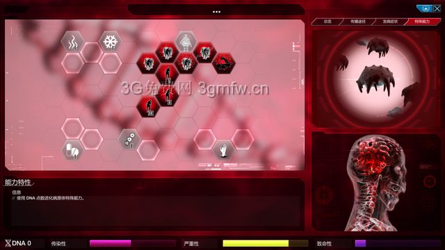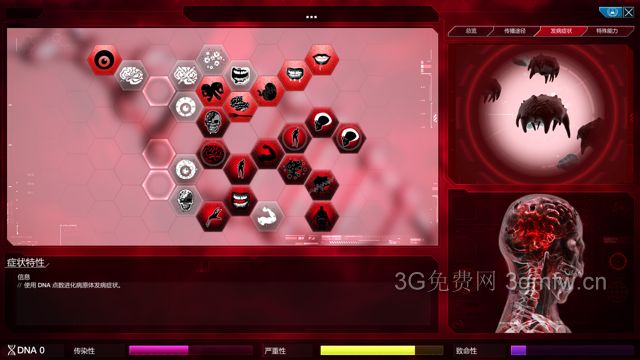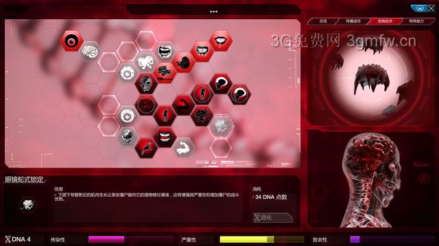 这里我讲一下,僵尸症状大体上分为4条线左侧线为敏捷线(通常情况下不推荐点)下侧为持续线(一般起辅助作用)右下侧为自爆线(主要加僵尸攻击力)最右侧为骨骼线(主要增加僵尸防御力)僵尸的破坏力主要依靠严重性,严重性越高,僵尸越强所以这里我们走右侧三条线路