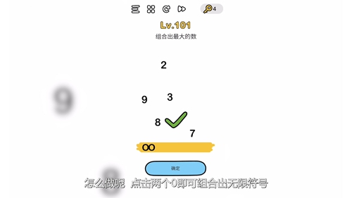 这一关最大的数其实是个无限符号,怎么做呢,点击两个0即可组合出无限符号。
