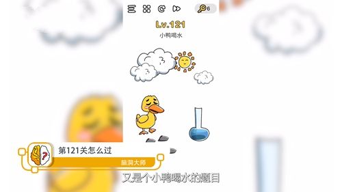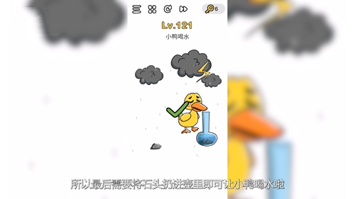 玩家需要先将云朵移到太阳处将太阳遮挡使天气变成雨天,然后会看到壶里的水也快满了但还不足以让小鸭喝到水。