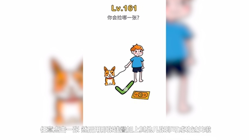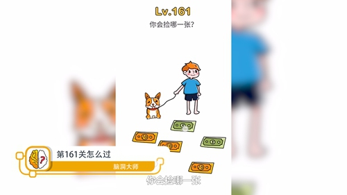 脑洞大师第161关怎么过? 脑洞大师第161关攻略 问题:你会捡哪一张? 答案: 地上有钱捡当然是都想捡到呀。 任意点击一张,然后用那张钱叠加上其他几张即可成功过关啦。 老友网www.andlaou.com免费为你分享