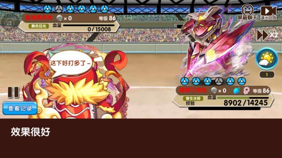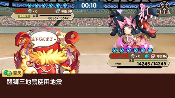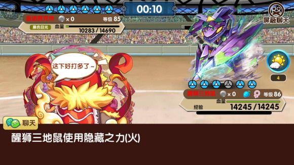 下面说说实战,醒狮三地鼠的定位非常清晰,就是收割。但是有些时候,它也是可以直接单挑的,比如上面这个大嘴娃,开局就说:你父亲来了,然而下一秒,它就知道谁是谁的父亲了。记住核心点:如果可以通过地上、岩石2个本系打出2倍或者4倍的,保证1发秒杀对面,都可以直接单挑。记住是保证1发秒杀对面,别傻了吧唧的去抓满血的乌龟、企鹅、水母这种。