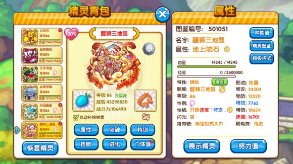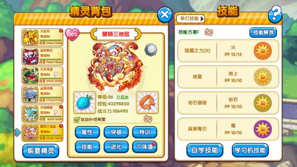 为了收割能力更强,技能当然要追求足够的打击面。我选择:火、地上、岩石、毒这4个属性。超级招式我开的超级灰尘射击,是为了弥补死神棺不在的毒尖钉,它还可以开超级地震,看队伍需求,我的沙漠蜻蜓已经是超级地震了。