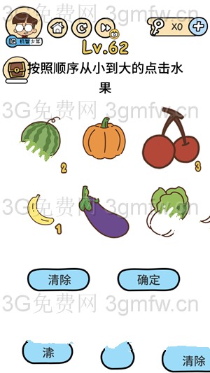 按照顺序从小到大的点击水果是脑洞大大大第62关的问题,很多玩家还不知道第6关怎么过答案是什么,为了让大家快速通关,小编带来了脑洞大大大第62关攻略。