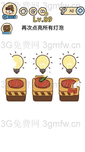再次点亮所有灯泡是脑洞大大大第89关的问题,很多玩家还不知道第6关怎么过答案是什么,为了让大家快速通关,小编带来了脑洞大大大第89关攻略。 问题:再次点亮所有灯泡? 答案:随便点,两根手指一起点。 老友网www.andlaou.com免费为你分享