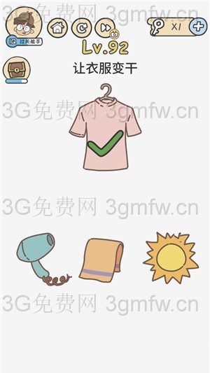 让衣服变干是脑洞大大大第92关的问题,很多玩家还不知道第6关怎么过答案是什么,为了让大家快速通关,小编带来了脑洞大大大第92关攻略。 问题:让衣服变干? 答案:用手指来回滑动衣服,直至甩干衣服。 老友网www.andlaou.com免费为你分享
