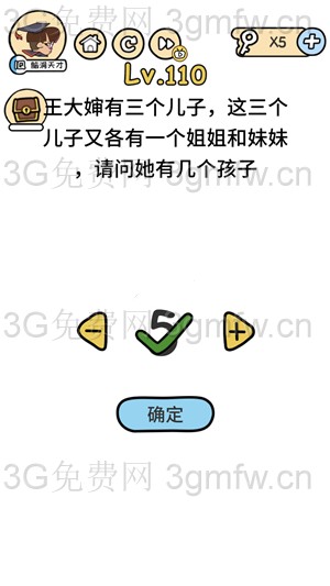 王大婶有三个儿子请问她有几个孩子是脑洞大大大第110关的问题,很多玩家还不知道第6关怎么过答案是什么,为了让大家快速通关,小编带来了脑洞大大大第110关攻略。
