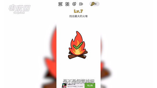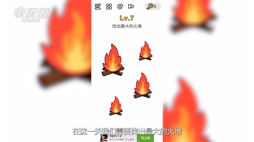 在这一关我们需要找出最大的火堆,如果按正常思维 很多小伙伴肯定会选左边第一个,但如果真是这样就不叫脑洞大师了,发散思维的做法 就是将几个火堆移到一块,不就合成了一个最大的火堆了吗。