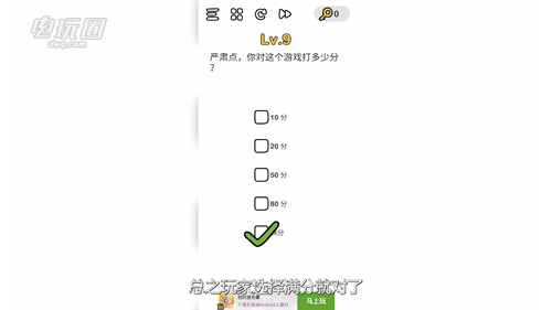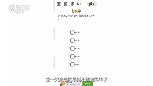 脑洞大师第9关怎么过? 脑洞大师第9关攻略 第9关问题:严肃点,你对这个游戏打多少分? 第9关答案: 给游戏打分不就是送分题么,就算不太满意也不能选其他分数。 总之玩家选择满分就对了。 老友网www.andlaou.com免费为你分享