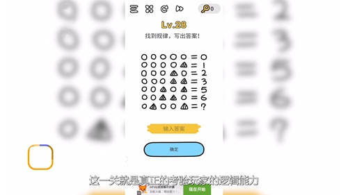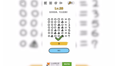 这一关就是真正的考验玩家的逻辑能力,根据前面的圆圈和三角形给出的等式后数字,我们可以算出答案是9。