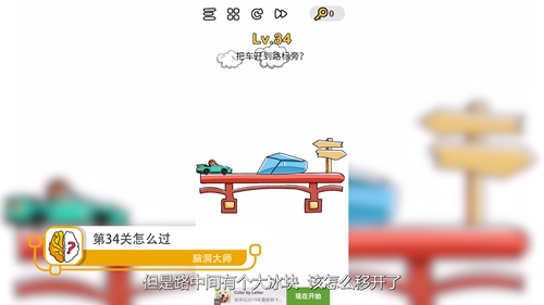 这一关我们需要把车开到路标旁,但是路中间有个大冰块该怎么移开呢。