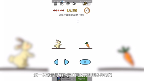 但是中间的路是断的,那么兔子怎么才能吃到胡萝卜呢,这一关设置得好像我们真的要利用各种技巧,又是跳跃键又是方向键还有生命值。