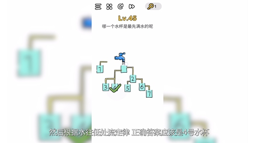 乍一看好像应该是1号,但如果我们挪动1号水杯就会发现,这个水杯并没有和水管连在一起,然后根据水往低处流定律,正确答案应该是4号水杯。
