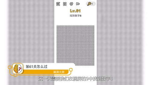 脑洞大师第61关怎么过? 脑洞大师第61关攻略 第61关问题:找到数字8? 第61关答案: 如果一个个找怕不是要看得眼花,还是直接来看看答案吧。 数字8就藏在右上角。 老友网www.andlaou.com免费为你分享