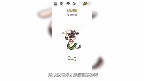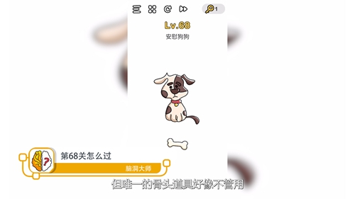 脑洞大师第68关怎么过? 脑洞大师第68关攻略 第68关问题:安慰狗狗? 第68关答案: 但唯一的骨头道具好像不管用,那该怎么办呢,试试抚摸狗狗吧,是不是轻松过关了呢。 所以说陪伴才是最重要的嘛。 老友网www.andlaou.com免费为你分享