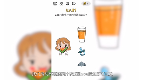 我们滑动杯底的果汁块送到zoe嘴边即可过关。