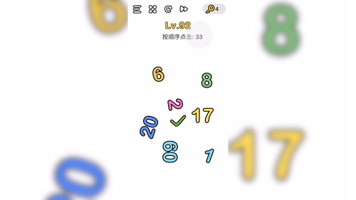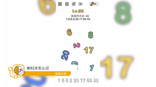 其实很简单,我们只需按照顺序从1开始点,依次点击6 8 2 20 17 60,最后点击题目旁边的33即可过关,题目旁边的33是最后点击的,很多小伙伴第一下就点了所以才过不了关。