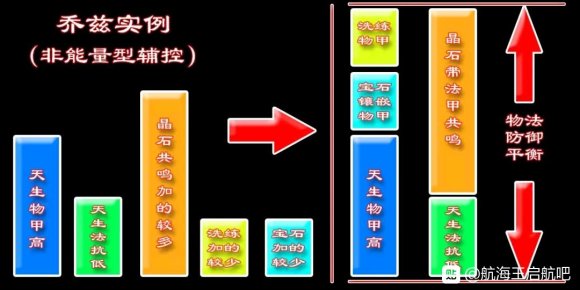 与晶石共鸣相比,洗练和宝石对防御的加成总量显然是偏少的,换句话说,晶石就是那根长积木,而洗练和宝石就是短积木。同时,由于乔兹本身是物理系人物,天生物甲较高,法抗较低,因此其先天的物甲也相当于长积木,而法抗也相当于短积木。如此一来,在前述积木原理中的长短搭配原则下,显然乔兹应该把洗练和宝石的重点放在物甲上,而把共鸣这根长积木具现化为法甲,弥补先天法抗不足的这根短积木。从而最终实现物甲和法抗的双高和平衡。