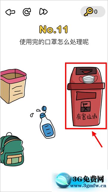 答案:滑动屏幕把口罩扔到有害垃圾的垃圾桶。本关卡主要考你废弃口罩应该如何处置。需要用到垃圾分类的知识。将界面往左侧滑动找到“有害垃圾”,将口罩拖到那里即可。
