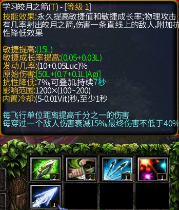 2. 被动-皎月之箭,增敏+物攻触发直线降双抗伤害,伤害型技能;需要卡斯蒂13级后才能学,加强后期伤害,在物理攻击敌人时有几率触发一个直线型伤害的皎月之箭,适合清怪;同时附加可叠加的双抗降低,后期降甲增伤效果好,伤害受飞行距离和敏捷影响,触发几率受幸运影响,冷却受活力影响;