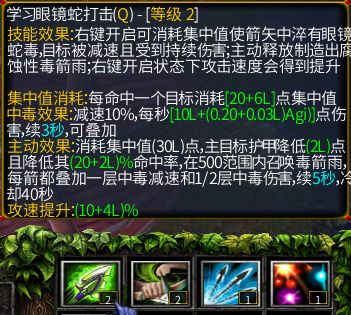 3. 主动Q-眼镜蛇打击,被动开启叠加毒减速,主动单体降甲致盲附带范围毒减速,主要伤害型技能;被动开启时提高攻速,平A耗蓝使目标中可叠加的毒,并造成减速,持续3秒,这意味着在3秒内尽可能地多平A能将输出最大化,关乎两点,一蓝量,二攻速,伤害值受敏捷和技能等级影响;主动施放时降低单体护甲附加致盲,并有AOE的可叠加毒减速;