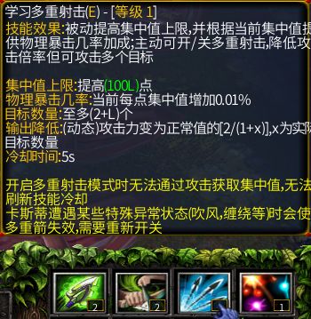 5. 主动E-多重射击,被动增蓝增物暴,主动多目标攻击,强化型技能;被动作为唯一的增蓝途径,同时也增加物理暴击几率,性价比较高;主动施放攻击多目标,但普攻伤害平摊、无法回蓝、无法刷新,一般情况不建议主动开启,收益不高;