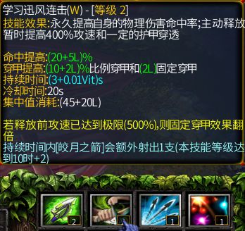 4. 主动W-迅风连击,提高命中+主动提速穿甲,强化型技能;被动提高命中,主动施放短时间提高400%攻速附带穿甲,但施法前摇较长,持续时长短,需要良好的站撸输出环境;攻速达到500%极限时穿甲翻倍,意味着溢出的攻速对此技能促进效果一样,持续时间受活力影响。持续时间内被动皎月之箭将额外射出1支,本技能达到10时额外2支;