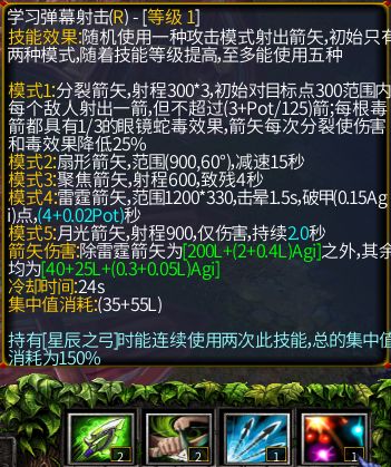 6. 主动R-弹幕射击,看脸技能,控制多样,伤害控制型技能;模式一:分裂箭,小范围群攻,附加三分之一蛇毒,敌人越多伤害越低,箭数受潜力影响;模式二:扇形箭,大范围减速;模式三:聚焦箭,攻击距离内,使目标致残降攻;模式四:雷霆箭,大范围群体高伤破甲晕眩,效果最好的箭;模式五:大范围群体持续伤害;上述箭矢伤害值都受敏捷和技能等级影响;