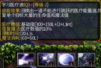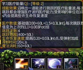 3. 主动Q-医疗波/能量,单体巨量治疗/群体回复治疗,辅助型技能;此治疗技能在夜间(18:00-6:00)与白天效果各异,但魔法消耗与冷却相同;夜间单体巨量治疗,适合单体扛伤,远程输出的团队作战;治疗效果受智力及技能等级影响;白天群体治疗附带提高回血速度,适合团队中扛伤较为分散时,治疗效果受智力和潜力及技能等级影响;