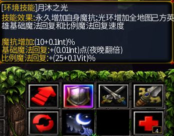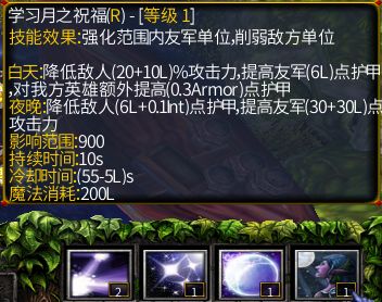 5. 主动R-月之祝福,范围增攻防降甲,辅助型技能;白天降敌人攻击,提高友军护甲;晚上降敌人护甲,提高友军攻击;强化和削弱效果受智力及技能等级影响,己方英雄护甲越高收益越大;