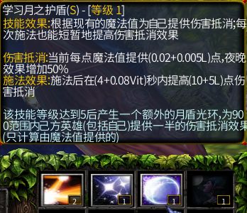 2. 被动-月之护盾,伤害抵消,防御型技能;伤害值抵消效果受当前魔法值和活力影响,夜晚抵消效果增加,技能5级后产生月盾光环,为周围英雄提供一半的当前魔法值相关计算伤害抵消;此技能给艾普丽尔提供了一定的生存能力,在5级后的群体保护能力较好;