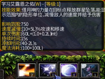 4. 主动W-艾露恩之佑,大范围反隐减速持续伤害,主要伤害型技能;在目标区域召唤群星,使隐身单位现身并对所有敌人造成伤害附带减双速,伤害值受智力及技能等级影响;