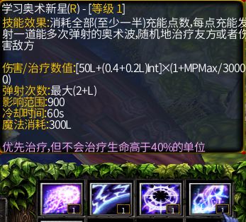 7. 主动R-奥术新星,弹射治疗/伤害,主要伤害型技能;消耗至少一半充能点数,随机治疗友方或伤害地方的弹射波,效果受最大魔法值,智力影响;