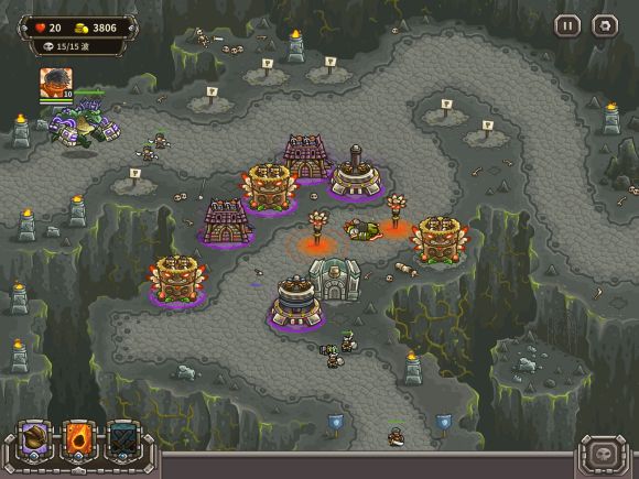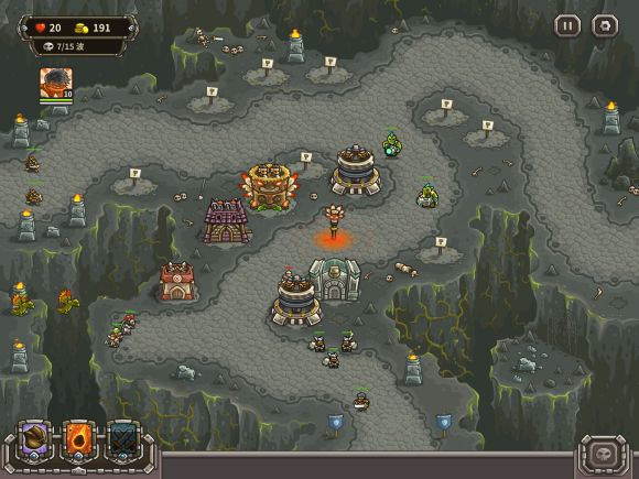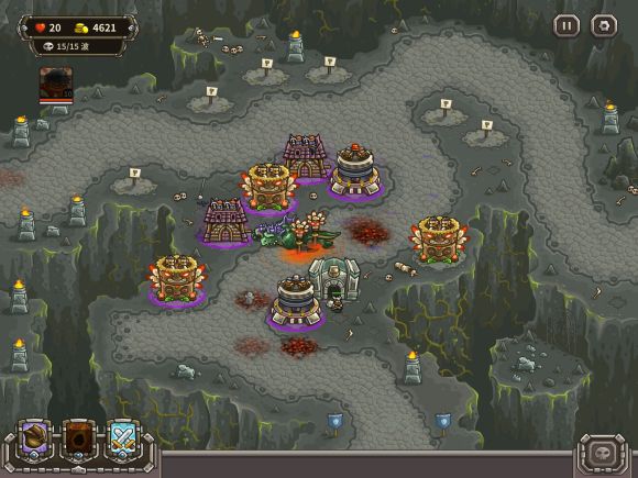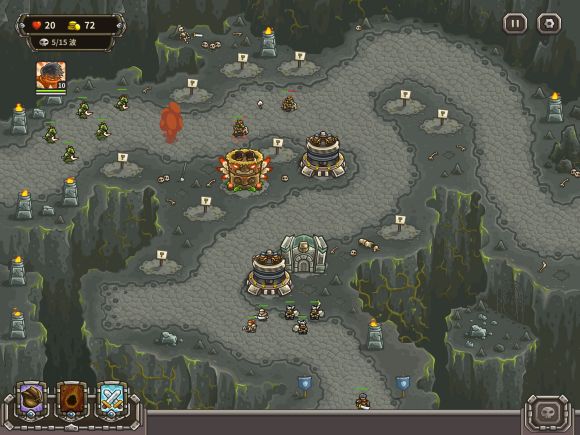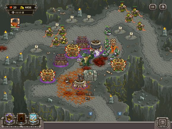 从第五波开始,蜥蜴人狙击手登场,为了让他踏入我们的磨床(即地震塔攻击范围),矮人和沙王都尽量向下拉,沙王可以直接拉到家门口,任凭磨床碾压小蜥蜴即可。接下来如下图二所示,分别点满图腾的虚弱并起一座弩堡,可以有效消灭未来战士,为了防御第七波的蜥蜴,如下图二左下角所示,摆满援兵并起三级箭塔(最终变为图腾)以保证消除飞行蜥蜴。从第八波开始都很简单,没有什么具体要说的,地震岩浆技能需要点满,如下图3摆放防御塔,弩堡点开全部两个技能,图腾只开虚弱就够了,但是钱多,想更求稳就随便建点什么吧。此阵容可以完美清理BOSS来临前的所有怪。(提示:BOSS来临前的疯狂飞行蜥蜴波不建议直接催出来,此阵容没有任何高达,清理飞行怪需要减少干扰)