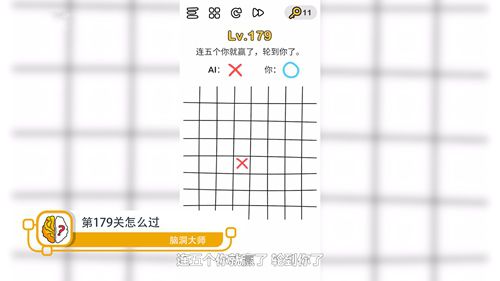 脑洞大师第179关怎么过? 脑洞大师第179关攻略 问题:连五个你就赢了 轮到你了? 答案: 又是下五子棋的游戏 我们还是需要作弊,这一关我们可以连续下五个棋子 连成一线即可过关啦。 老友网www.andlaou.com免费为你分享
