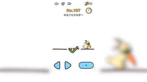 又是兔子吃萝卜但老套路已经用不上了,不妨试试搭条路出来吧,将5颗红心移到断桥处再使用方向键即可帮助兔子吃到胡萝卜。