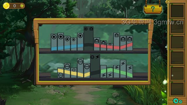 6.棚子下边有四个图形的游戏,从左下边开始,因为那里有一个空位,方便调整,分别把四个图形归类,线路连接,出现蓝红黄绿颜色。