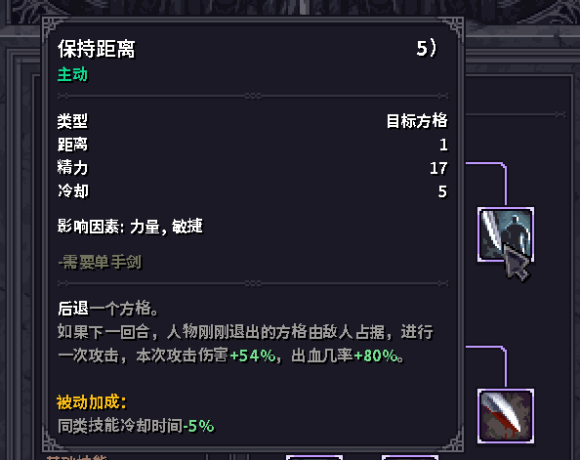 核心技能为剑的保持距离已经匕首的换位躲避。无伤下血能力强,应变强,对应未知的更新适应力强。且由于匕首切换武器不计算回合数,后期剑匕点满后还可以点弓箭,可玩性极高,适应力极强。