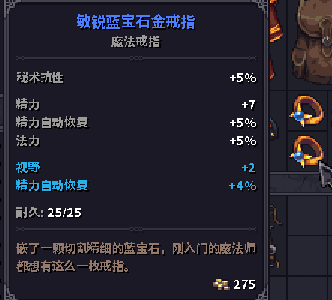 这个游戏很有意思 戒指的属性是材质+宝石那么来的 黄金材质的戒指都会有法力和精力回复 而蓝宝石会有精力回复和精力 因此..