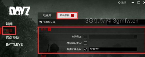 选择开始界面中的参数,打开所有参数,找到基本中的配置文件名称,在前面方框内打勾并更改自己的游戏名称,名字仅支持英文字母和符号,具体操作如图中红色方框: